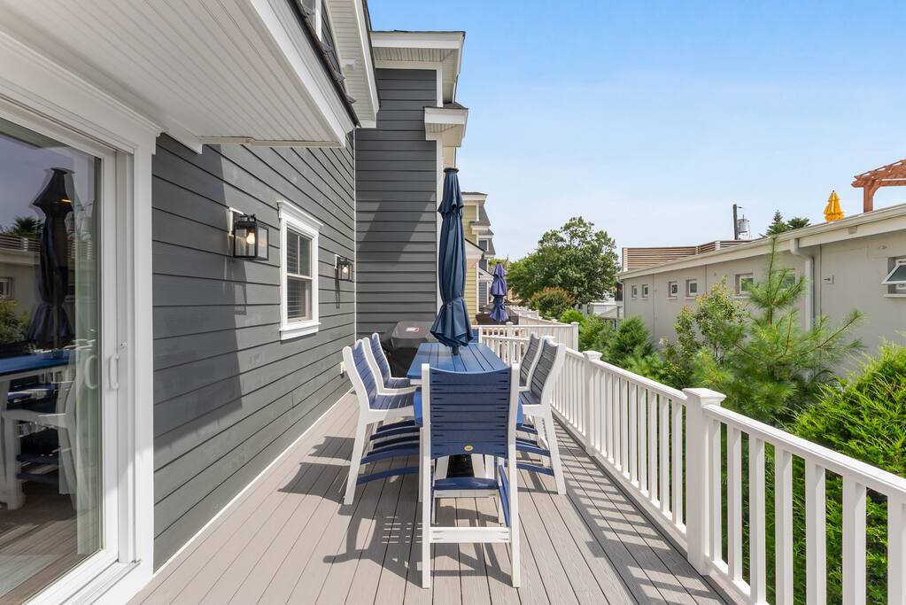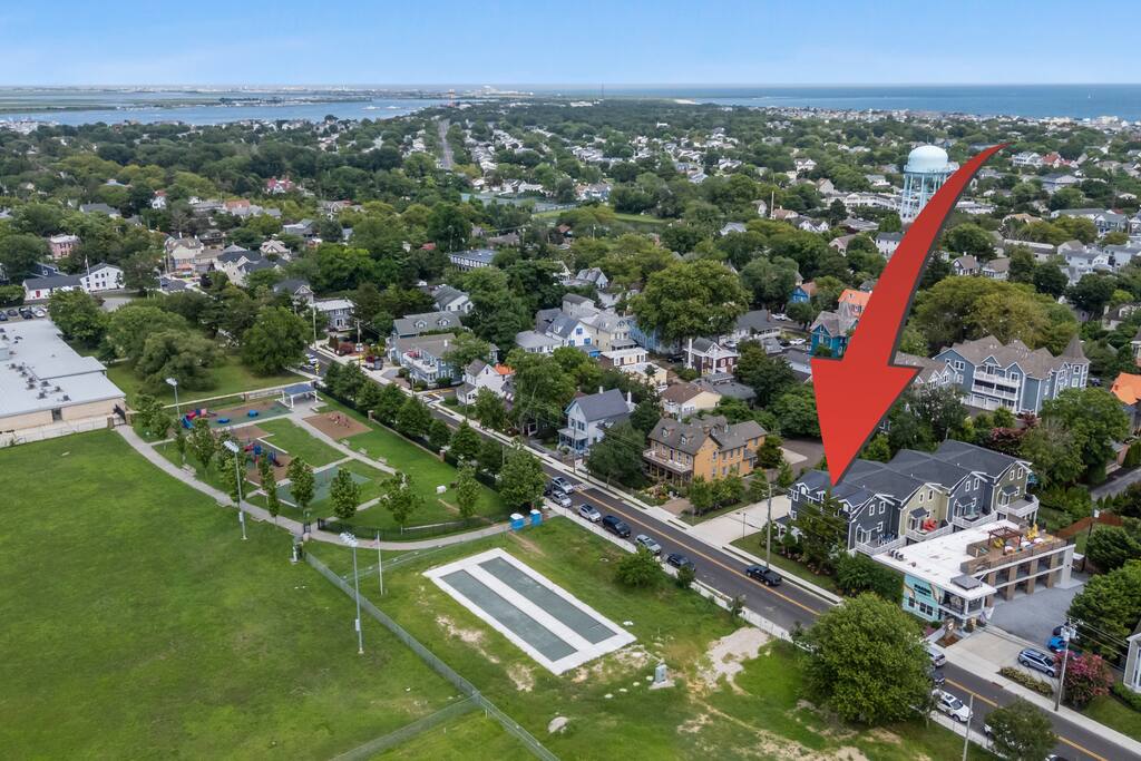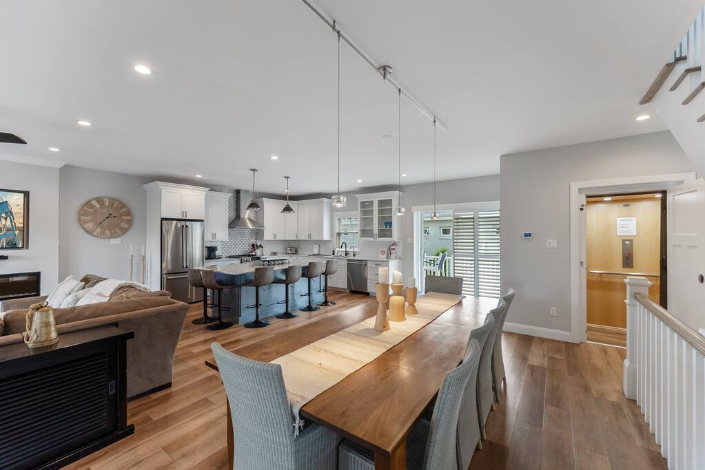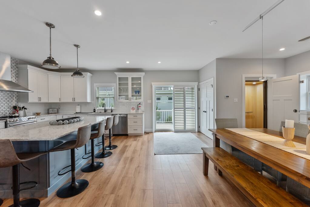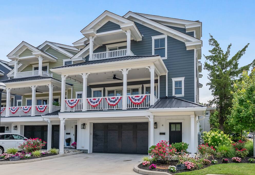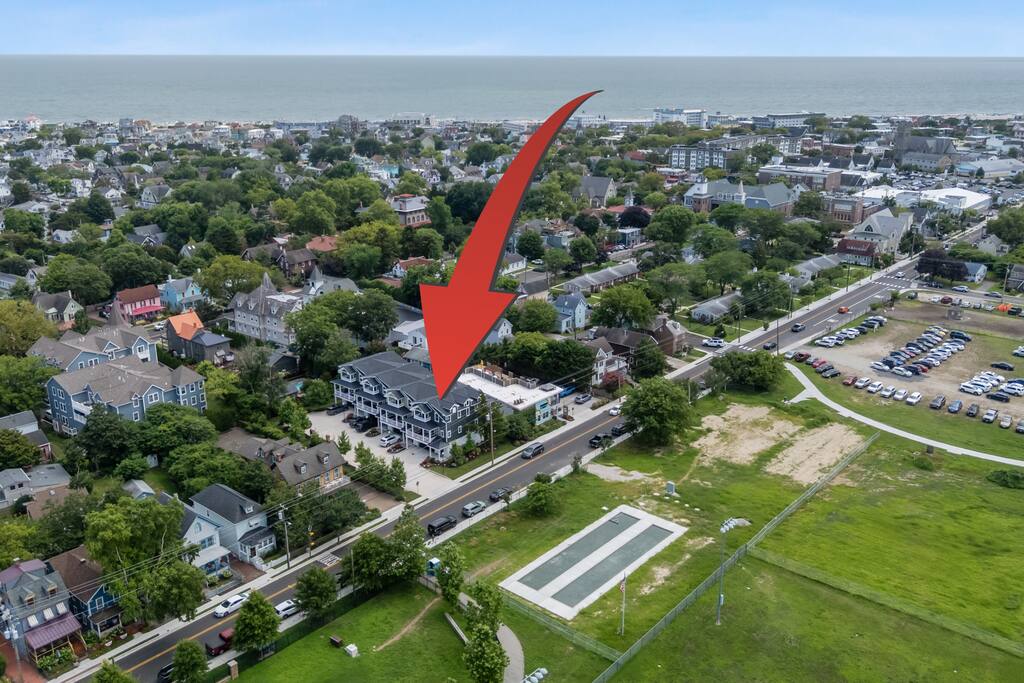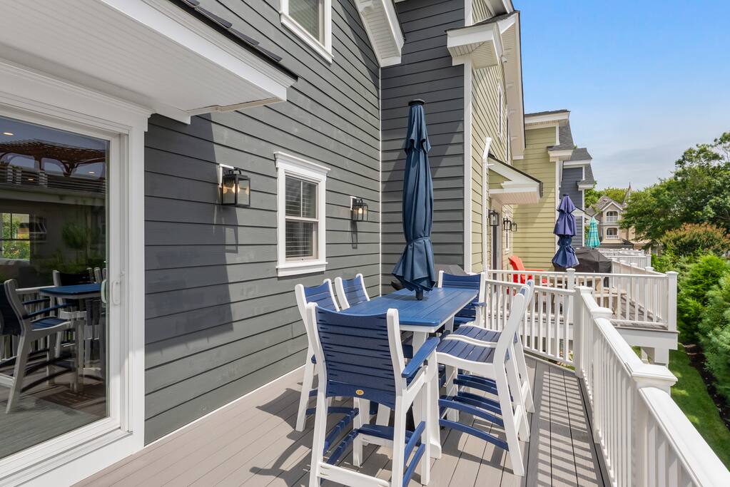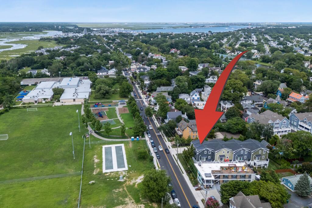 Newly Constructed End Unit Townhome in Downtown Historic Cape May NJ. The home is within walking distance to the beach, Washington St Mall and many restaurants/bars and shopping. Home is across the street from a park and a newly constructed nature/birding trail. Home Features: FEATURES: *Sleeps 8 guests, 4 bedrooms all with private full baths and TV's; 2 King, 2 Queen *Linens and Bath Towels Provided *4.5 Bathrooms *Elevator to all floors *Open Concept Living Room with Fireplace and modern kitchen with large island and dining table. *Two front private covered decks and one back private deck with BBQ grill and large dining table *Electric fireplace in Living Room *Two car garage with EV Charger *Walk to shops, restaurants, beach *Short drive to multiple wineries and golf courses *Close to Cape May/Lewes Ferry for day trips to Lewes, Rehobeth, Dewey, etc **BEDROOMS** All Bedrooms have private full baths attached for personal comfort and convenience. Linens and Bath Towels are provided. FIRST FLOOR: - One bedroom with King Bed and attached full bathroom w/ walk in shower, smart tv. THIRD FLOOR: - Large Primary Suite with king size bed, smart tv, dresser, closet, private covered patio, private bath with walk in shower, double sink vanity and private toilet closet. - Two more bedrooms with smart tv's, queen size beds, attached private baths, one with walk in shower, one with a bath tub/shower. **LIVING ROOM, KITCHEN and DECKS** Seamless flow of open concept living, dining, kitchen and large front and back decks set the stage for memorable moments. Living room has a large sectional couch with plenty of seating, heated electric fireplace, and large HD smart TV for fun movie nights or watching sports. Fully equipped modern kitchen with plenty of seating - a large island with 6 barstools, a separate dining table for 10 people, outdoor dining table for 6 people on the back deck and lounge seating on the front covered patio w/ ceiling fan. All of the amenities of a modern kitchen - Keurig coffee maker, electric induction stove/oven, microwave drawer and beverage fridge in the island, full size refrigerator/freezer, dishwasher. Plates, silverware, drinkware, serving and cooking utensils, pot/pans, bakeware. Prefer the outdoor grilling experience? Fire up the natural gas piped grill with the convenience of supplied utensils. Enjoy morning coffee or evening beverages on the large furnished, covered from patio just off of the living room. Or sit out back with sunshine on your face on the large open deck w/ polywood dining table and chairs just off the kitchen. A half bathroom for convenience, rounds out this floor. **GARAGE** Private Garage for 2 cars with driveway for additional 2 car parking, Garage is also equipped with an EV Wall Charger. Complimentary for guests during their stay. **ELEVATOR** Private Elevator providing accessibility to all 3 floors is perfect for those with mobility issues and is great for unloading groceries and accessing the upper floors of the home. **OUTDOOR SHOWER** Private enclosed outdoor shower in the backyard is perfect for rinsing off after a fun and relaxing day at the beach or walking through any of the multiple walking and birding trails.