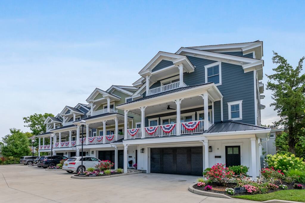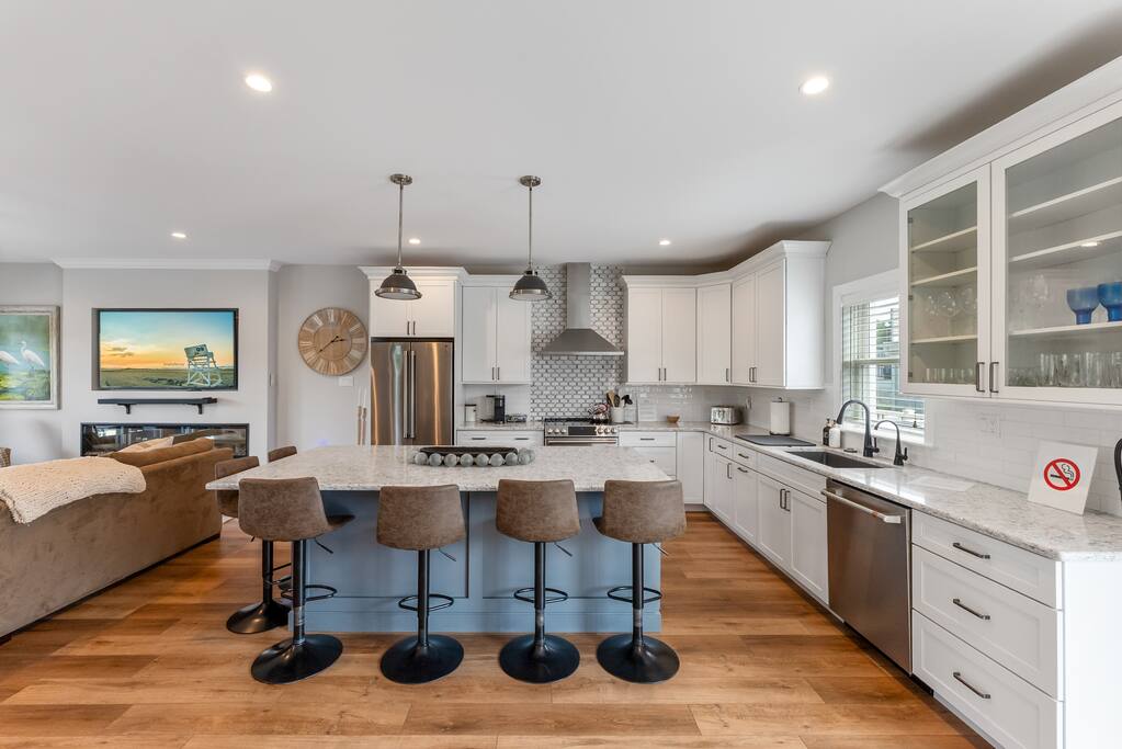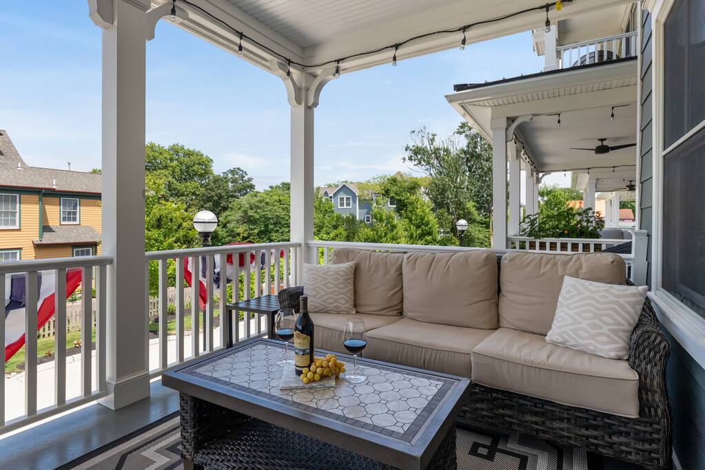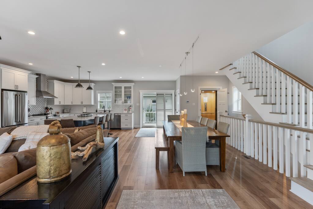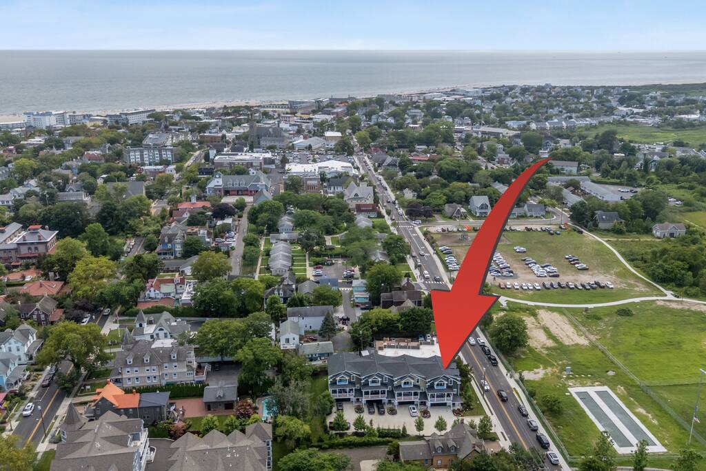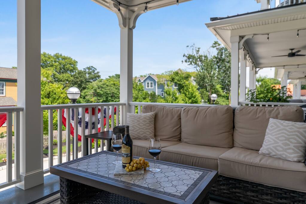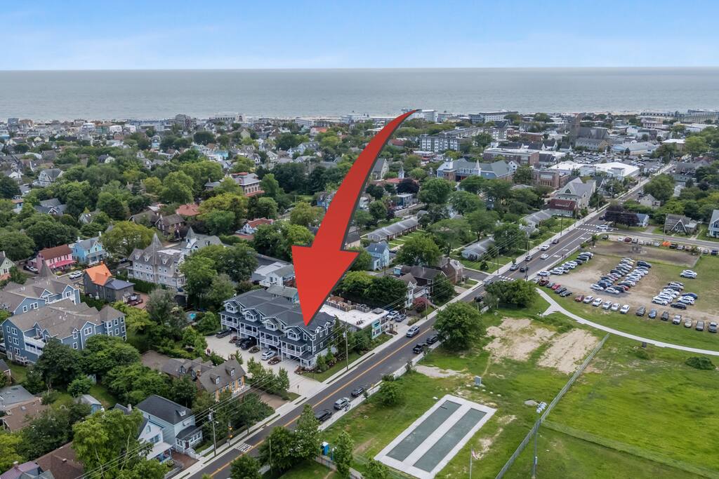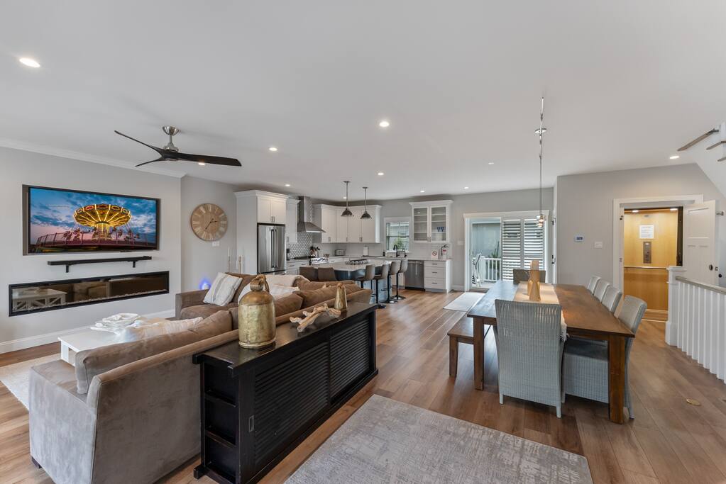 Newly Constructed End Unit Townhome in Downtown Historic Cape May NJ. The home is within walking distance to the beach, Washington St Mall and many restaurants/bars and shopping. Home is across the street from a park and a newly constructed nature/birding trail. Home Features: FEATURES: *Sleeps 8 guests, 4 bedrooms all with private full baths and TV's; 2 King, 2 Queen *Linens and Bath Towels Provided *4.5 Bathrooms *Elevator to all floors *Open Concept Living Room with Fireplace and modern kitchen with large island and dining table. *Two front private covered decks and one back private deck with BBQ grill and large dining table *Electric fireplace in Living Room *Two car garage with EV Charger *Walk to shops, restaurants, beach *Short drive to multiple wineries and golf courses *Close to Cape May/Lewes Ferry for day trips to Lewes, Rehobeth, Dewey, etc **BEDROOMS** All Bedrooms have private full baths attached for personal comfort and convenience. Linens and Bath Towels are provided. FIRST FLOOR: - One bedroom with King Bed and attached full bathroom w/ walk in shower, smart tv. THIRD FLOOR: - Large Primary Suite with king size bed, smart tv, dresser, closet, private covered patio, private bath with walk in shower, double sink vanity and private toilet closet. - Two more bedrooms with smart tv's, queen size beds, attached private baths, one with walk in shower, one with a bath tub/shower. **LIVING ROOM, KITCHEN and DECKS** Seamless flow of open concept living, dining, kitchen and large front and back decks set the stage for memorable moments. Living room has a large sectional couch with plenty of seating, heated electric fireplace, and large HD smart TV for fun movie nights or watching sports. Fully equipped modern kitchen with plenty of seating - a large island with 6 barstools, a separate dining table for 10 people, outdoor dining table for 6 people on the back deck and lounge seating on the front covered patio w/ ceiling fan. All of the amenities of a modern kitchen - Keurig coffee maker, electric induction stove/oven, microwave drawer and beverage fridge in the island, full size refrigerator/freezer, dishwasher. Plates, silverware, drinkware, serving and cooking utensils, pot/pans, bakeware. Prefer the outdoor grilling experience? Fire up the natural gas piped grill with the convenience of supplied utensils. Enjoy morning coffee or evening beverages on the large furnished, covered from patio just off of the living room. Or sit out back with sunshine on your face on the large open deck w/ polywood dining table and chairs just off the kitchen. A half bathroom for convenience, rounds out this floor. **GARAGE** Private Garage for 2 cars with driveway for additional 2 car parking, Garage is also equipped with an EV Wall Charger. Complimentary for guests during their stay. **ELEVATOR** Private Elevator providing accessibility to all 3 floors is perfect for those with mobility issues and is great for unloading groceries and accessing the upper floors of the home. **OUTDOOR SHOWER** Private enclosed outdoor shower in the backyard is perfect for rinsing off after a fun and relaxing day at the beach or walking through any of the multiple walking and birding trails.