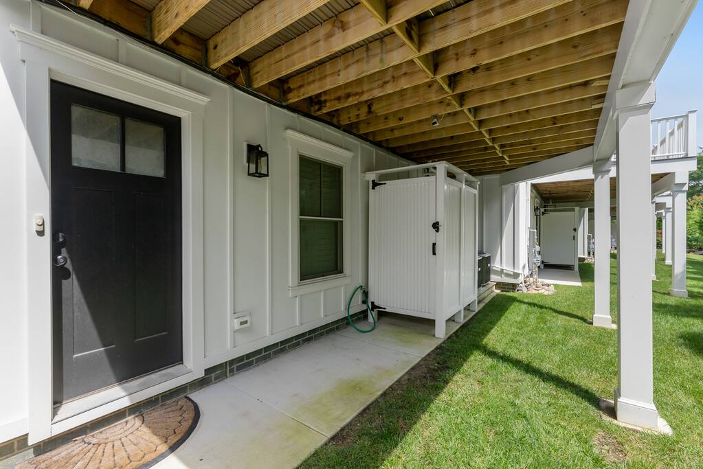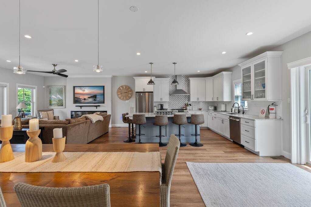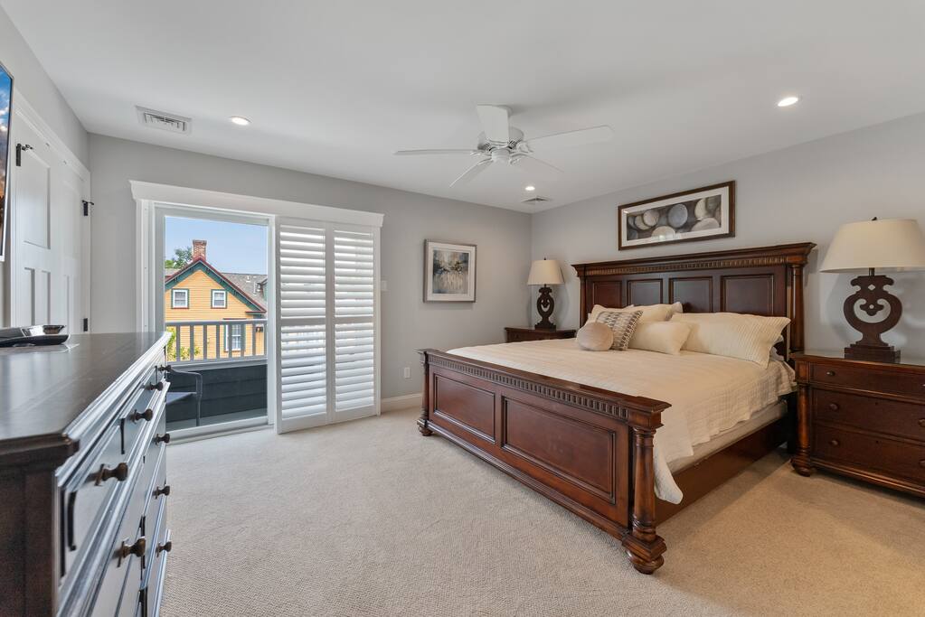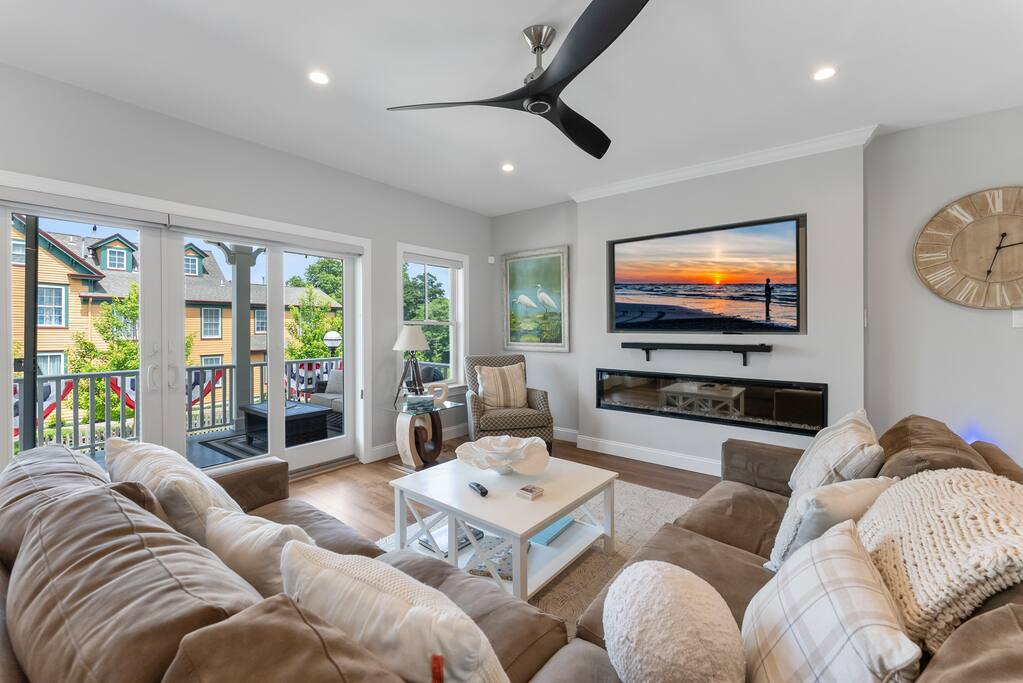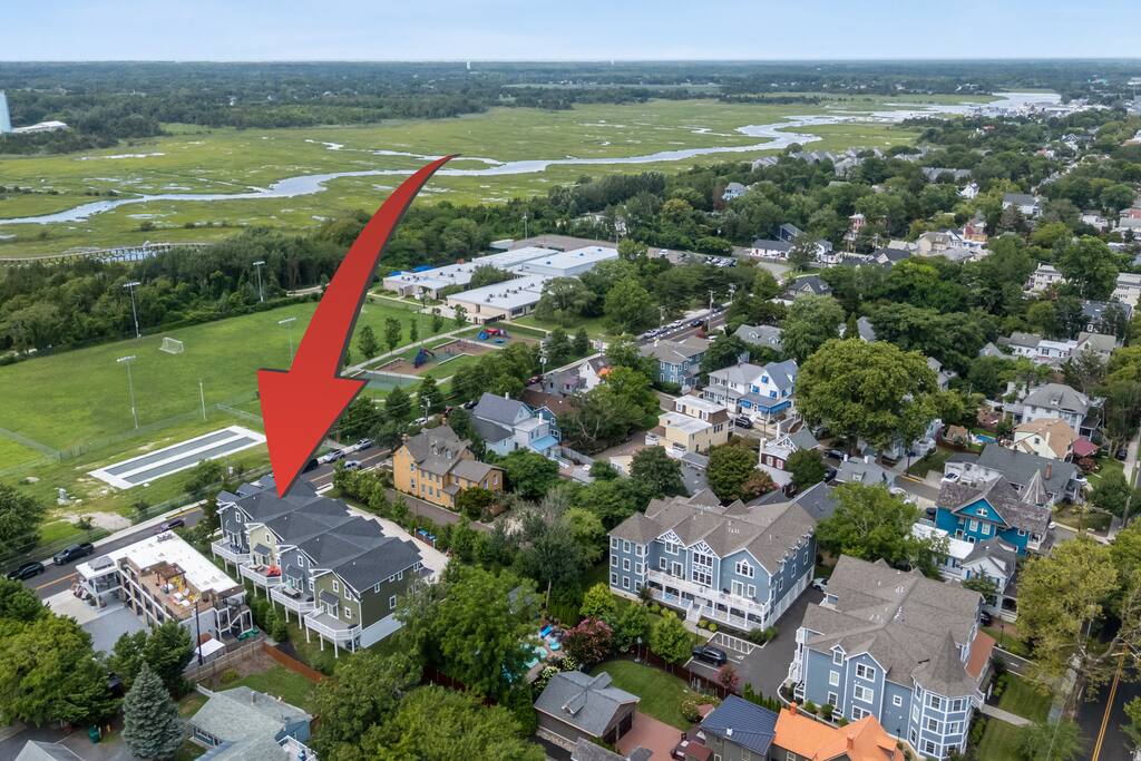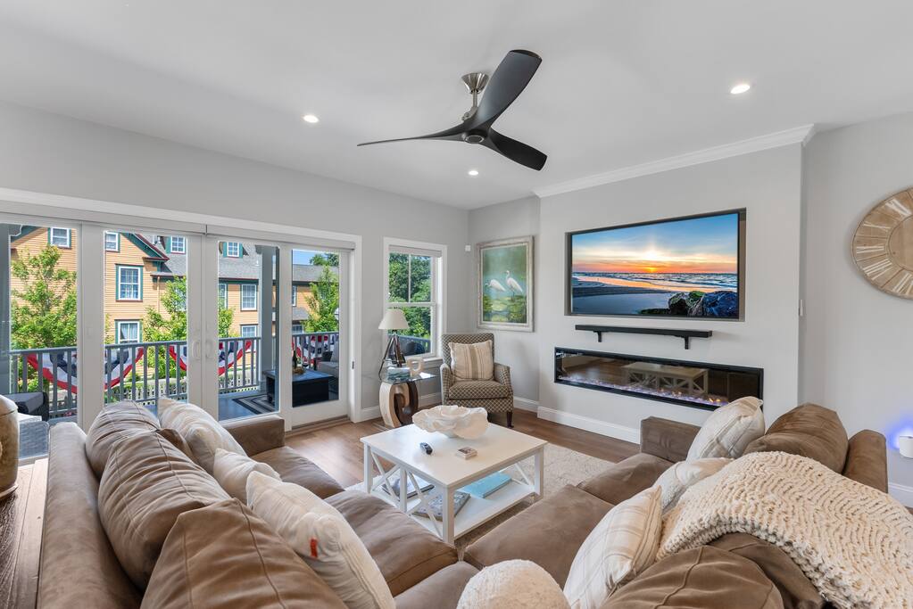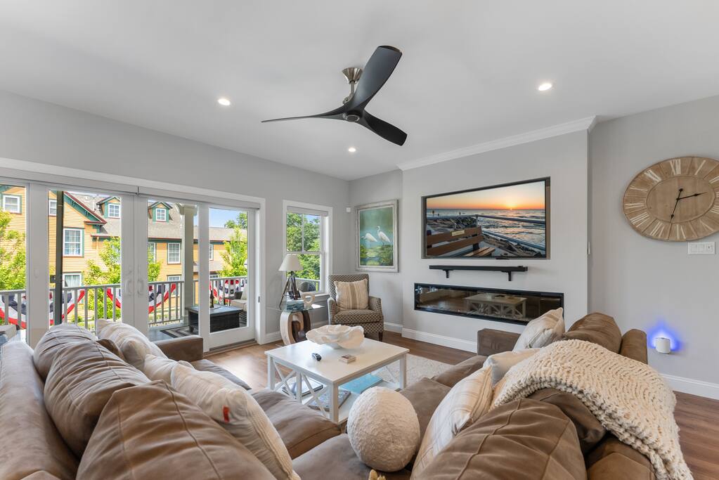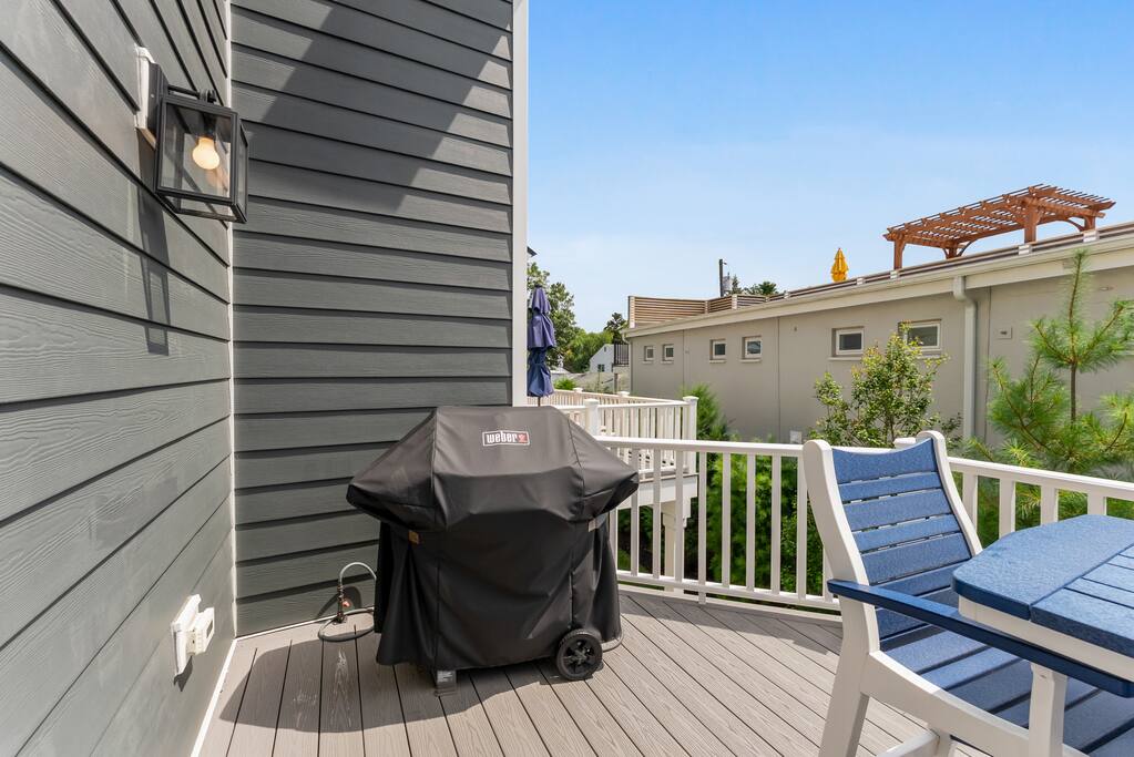 Newly Constructed End Unit Townhome in Downtown Historic Cape May NJ. The home is within walking distance to the beach, Washington St Mall and many restaurants/bars and shopping. Home is across the street from a park and a newly constructed nature/birding trail. Home Features: FEATURES: *Sleeps 8 guests, 4 bedrooms all with private full baths and TV's; 2 King, 2 Queen *Linens and Bath Towels Provided *4.5 Bathrooms *Elevator to all floors *Open Concept Living Room with Fireplace and modern kitchen with large island and dining table. *Two front private covered decks and one back private deck with BBQ grill and large dining table *Electric fireplace in Living Room *Two car garage with EV Charger *Walk to shops, restaurants, beach *Short drive to multiple wineries and golf courses *Close to Cape May/Lewes Ferry for day trips to Lewes, Rehobeth, Dewey, etc **BEDROOMS** All Bedrooms have private full baths attached for personal comfort and convenience. Linens and Bath Towels are provided. FIRST FLOOR: - One bedroom with King Bed and attached full bathroom w/ walk in shower, smart tv. THIRD FLOOR: - Large Primary Suite with king size bed, smart tv, dresser, closet, private covered patio, private bath with walk in shower, double sink vanity and private toilet closet. - Two more bedrooms with smart tv's, queen size beds, attached private baths, one with walk in shower, one with a bath tub/shower. **LIVING ROOM, KITCHEN and DECKS** Seamless flow of open concept living, dining, kitchen and large front and back decks set the stage for memorable moments. Living room has a large sectional couch with plenty of seating, heated electric fireplace, and large HD smart TV for fun movie nights or watching sports. Fully equipped modern kitchen with plenty of seating - a large island with 6 barstools, a separate dining table for 10 people, outdoor dining table for 6 people on the back deck and lounge seating on the front covered patio w/ ceiling fan. All of the amenities of a modern kitchen - Keurig coffee maker, electric induction stove/oven, microwave drawer and beverage fridge in the island, full size refrigerator/freezer, dishwasher. Plates, silverware, drinkware, serving and cooking utensils, pot/pans, bakeware. Prefer the outdoor grilling experience? Fire up the natural gas piped grill with the convenience of supplied utensils. Enjoy morning coffee or evening beverages on the large furnished, covered from patio just off of the living room. Or sit out back with sunshine on your face on the large open deck w/ polywood dining table and chairs just off the kitchen. A half bathroom for convenience, rounds out this floor. **GARAGE** Private Garage for 2 cars with driveway for additional 2 car parking, Garage is also equipped with an EV Wall Charger. Complimentary for guests during their stay. **ELEVATOR** Private Elevator providing accessibility to all 3 floors is perfect for those with mobility issues and is great for unloading groceries and accessing the upper floors of the home. **OUTDOOR SHOWER** Private enclosed outdoor shower in the backyard is perfect for rinsing off after a fun and relaxing day at the beach or walking through any of the multiple walking and birding trails.