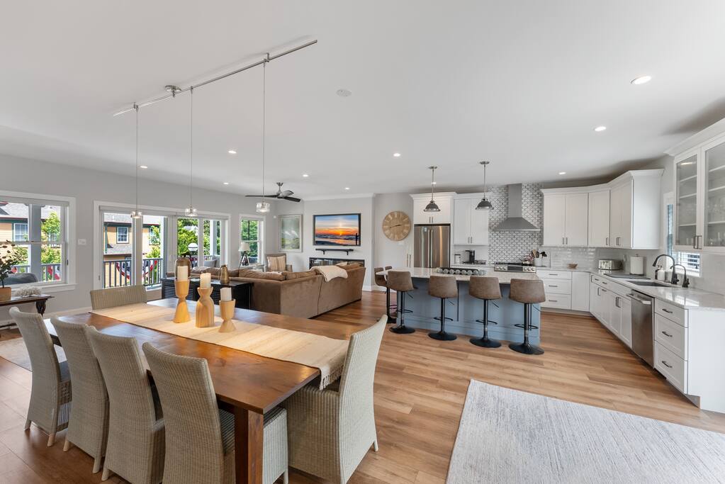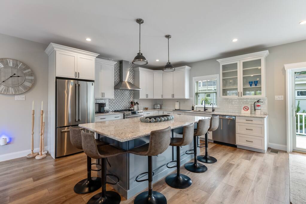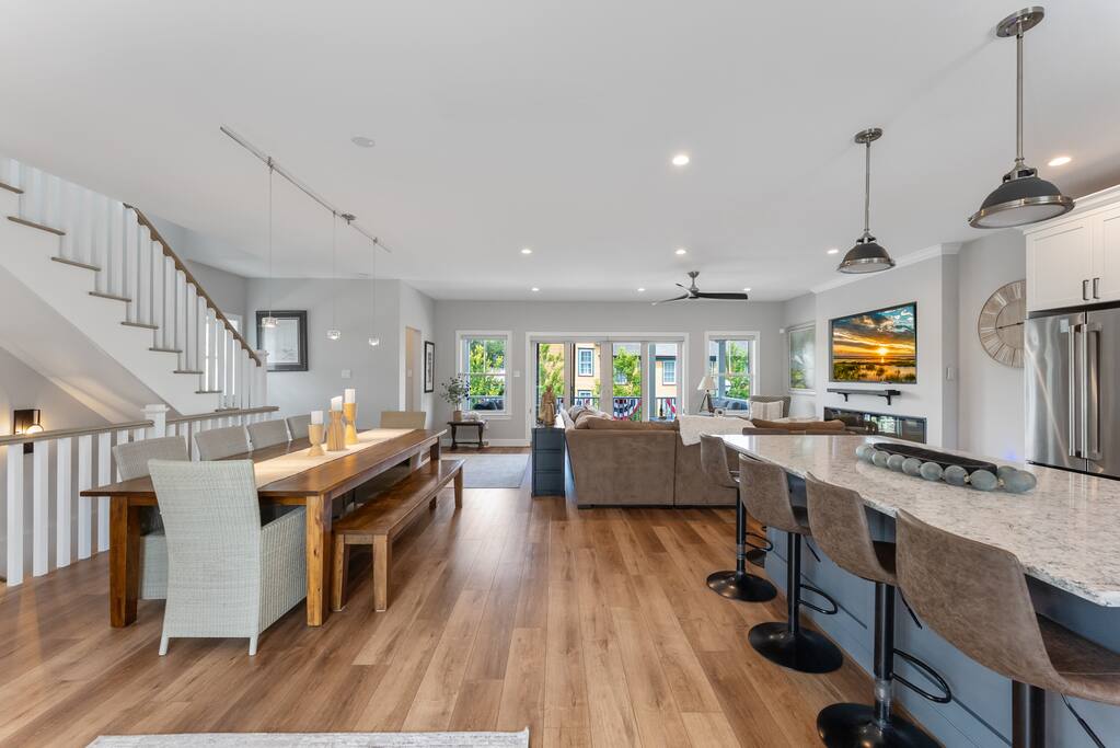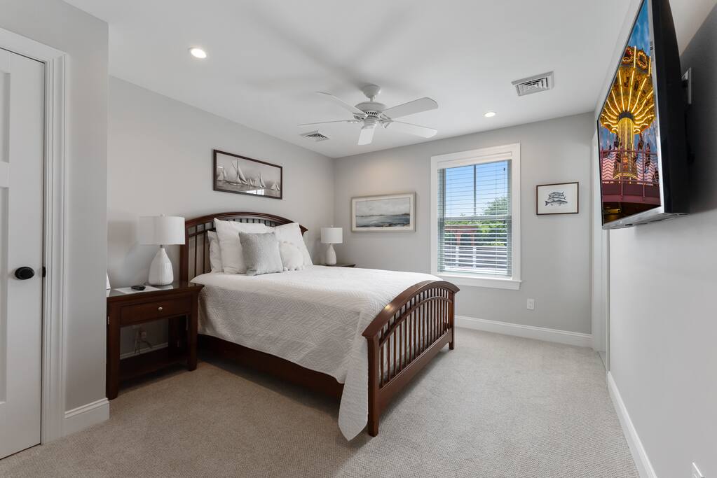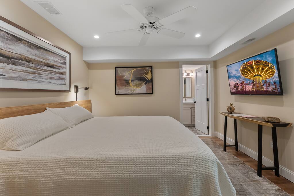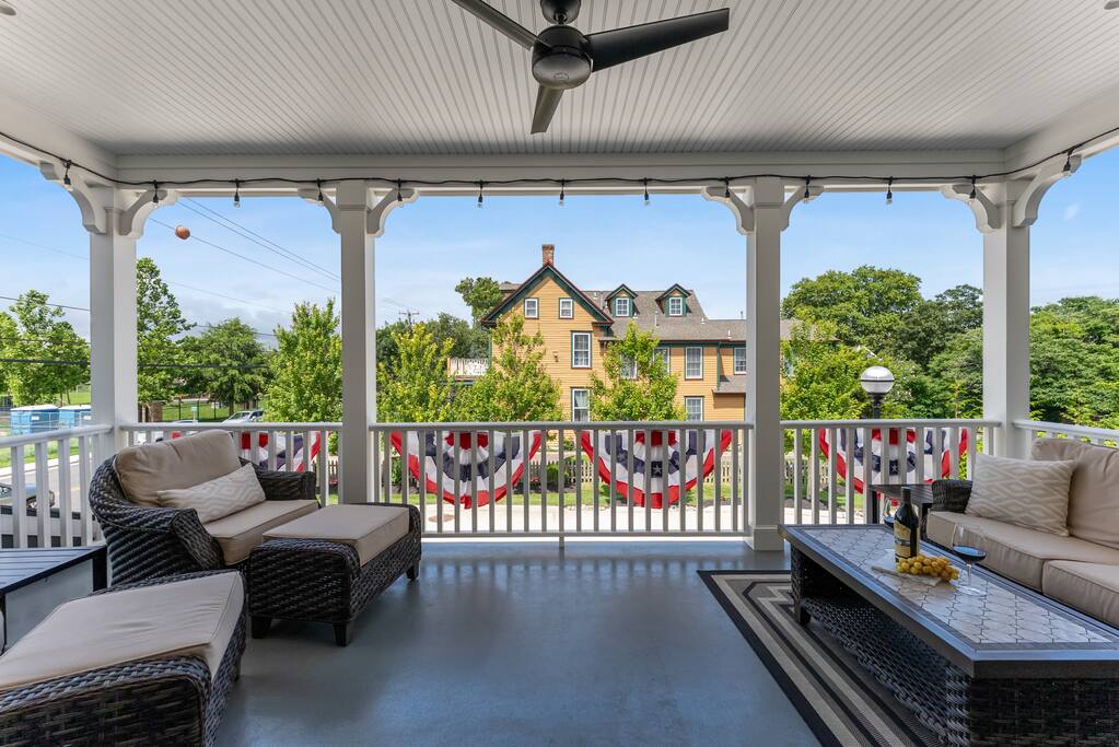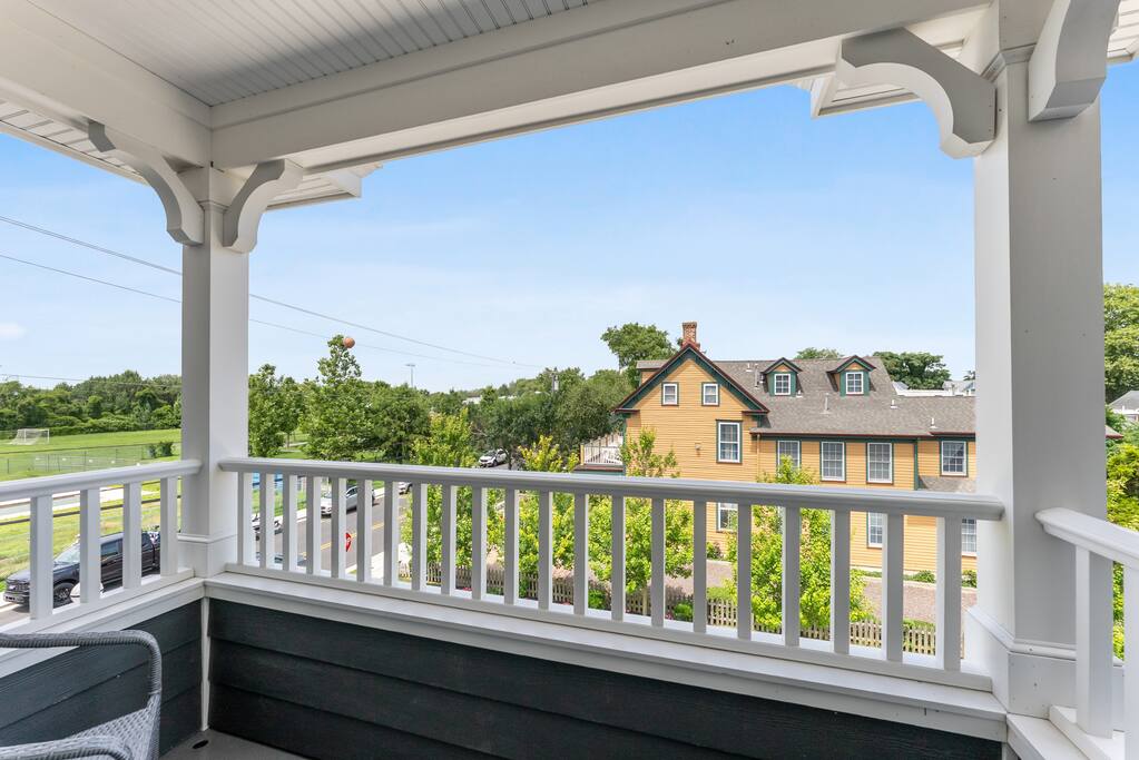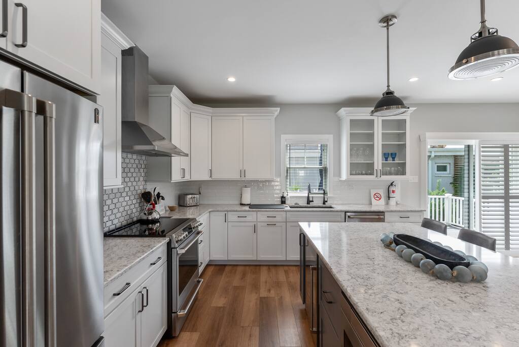 Newly Constructed End Unit Townhome in Downtown Historic Cape May NJ. The home is within walking distance to the beach, Washington St Mall and many restaurants/bars and shopping. Home is across the street from a park and a newly constructed nature/birding trail. Home Features: FEATURES: *Sleeps 8 guests, 4 bedrooms all with private full baths and TV's; 2 King, 2 Queen *Linens and Bath Towels Provided *4.5 Bathrooms *Elevator to all floors *Open Concept Living Room with Fireplace and modern kitchen with large island and dining table. *Two front private covered decks and one back private deck with BBQ grill and large dining table *Electric fireplace in Living Room *Two car garage with EV Charger *Walk to shops, restaurants, beach *Short drive to multiple wineries and golf courses *Close to Cape May/Lewes Ferry for day trips to Lewes, Rehobeth, Dewey, etc **BEDROOMS** All Bedrooms have private full baths attached for personal comfort and convenience. Linens and Bath Towels are provided. FIRST FLOOR: - One bedroom with King Bed and attached full bathroom w/ walk in shower, smart tv. THIRD FLOOR: - Large Primary Suite with king size bed, smart tv, dresser, closet, private covered patio, private bath with walk in shower, double sink vanity and private toilet closet. - Two more bedrooms with smart tv's, queen size beds, attached private baths, one with walk in shower, one with a bath tub/shower. **LIVING ROOM, KITCHEN and DECKS** Seamless flow of open concept living, dining, kitchen and large front and back decks set the stage for memorable moments. Living room has a large sectional couch with plenty of seating, heated electric fireplace, and large HD smart TV for fun movie nights or watching sports. Fully equipped modern kitchen with plenty of seating - a large island with 6 barstools, a separate dining table for 10 people, outdoor dining table for 6 people on the back deck and lounge seating on the front covered patio w/ ceiling fan. All of the amenities of a modern kitchen - Keurig coffee maker, electric induction stove/oven, microwave drawer and beverage fridge in the island, full size refrigerator/freezer, dishwasher. Plates, silverware, drinkware, serving and cooking utensils, pot/pans, bakeware. Prefer the outdoor grilling experience? Fire up the natural gas piped grill with the convenience of supplied utensils. Enjoy morning coffee or evening beverages on the large furnished, covered from patio just off of the living room. Or sit out back with sunshine on your face on the large open deck w/ polywood dining table and chairs just off the kitchen. A half bathroom for convenience, rounds out this floor. **GARAGE** Private Garage for 2 cars with driveway for additional 2 car parking, Garage is also equipped with an EV Wall Charger. Complimentary for guests during their stay. **ELEVATOR** Private Elevator providing accessibility to all 3 floors is perfect for those with mobility issues and is great for unloading groceries and accessing the upper floors of the home. **OUTDOOR SHOWER** Private enclosed outdoor shower in the backyard is perfect for rinsing off after a fun and relaxing day at the beach or walking through any of the multiple walking and birding trails.