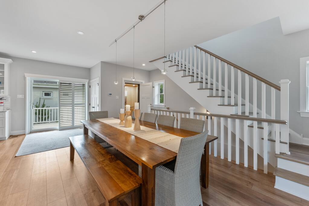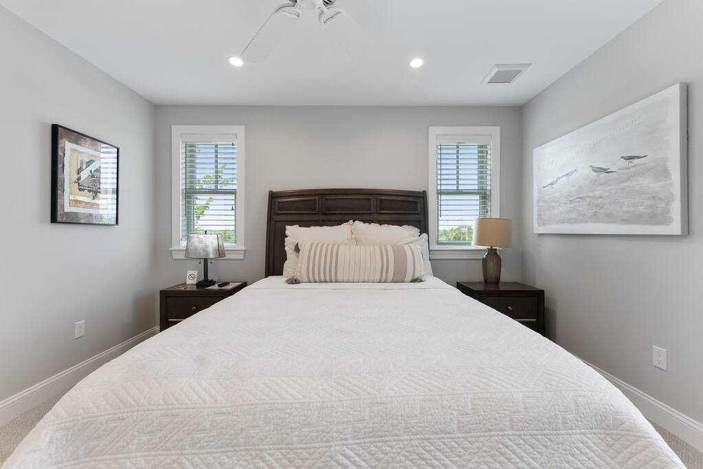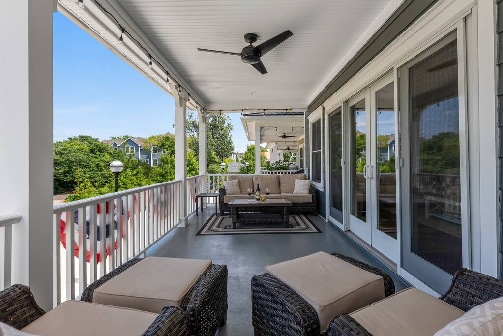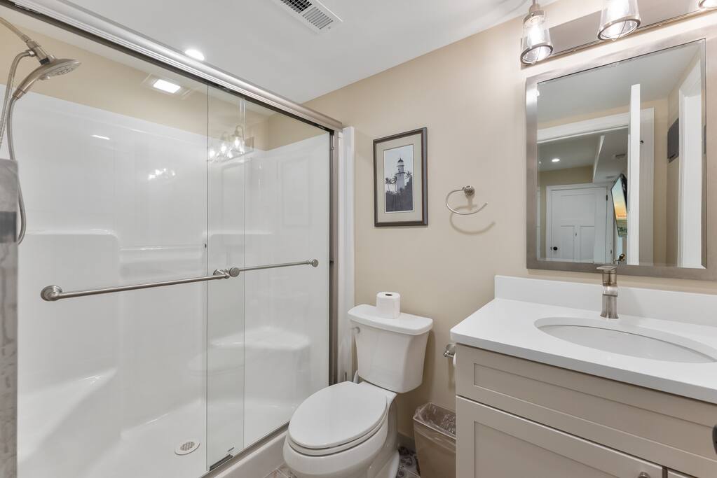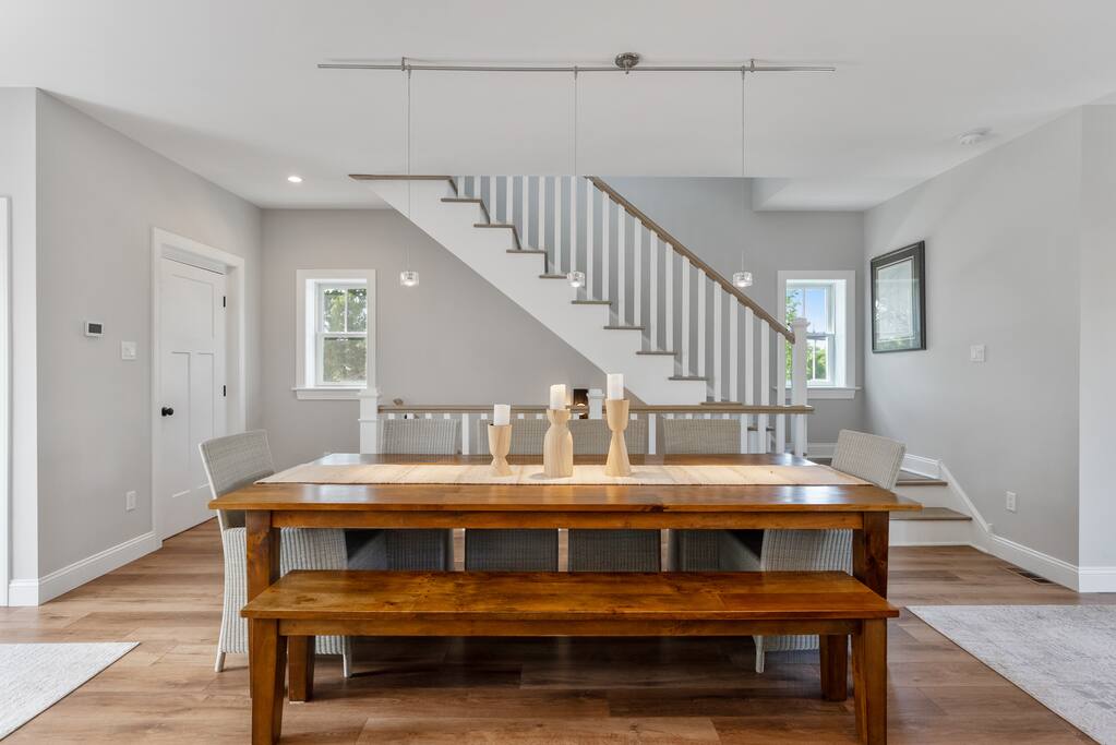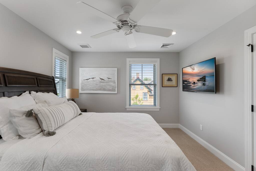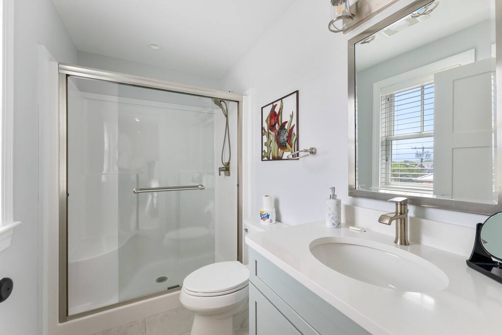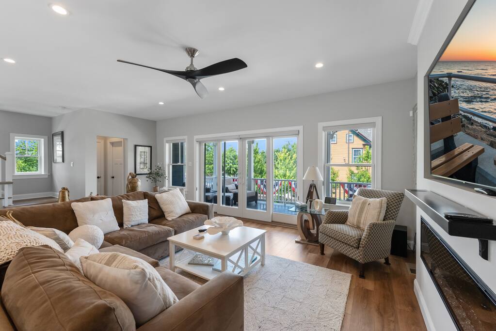 Newly Constructed End Unit Townhome in Downtown Historic Cape May NJ. The home is within walking distance to the beach, Washington St Mall and many restaurants/bars and shopping. Home is across the street from a park and a newly constructed nature/birding trail. Home Features: FEATURES: *Sleeps 8 guests, 4 bedrooms all with private full baths and TV's; 2 King, 2 Queen *Linens and Bath Towels Provided *4.5 Bathrooms *Elevator to all floors *Open Concept Living Room with Fireplace and modern kitchen with large island and dining table. *Two front private covered decks and one back private deck with BBQ grill and large dining table *Electric fireplace in Living Room *Two car garage with EV Charger *Walk to shops, restaurants, beach *Short drive to multiple wineries and golf courses *Close to Cape May/Lewes Ferry for day trips to Lewes, Rehobeth, Dewey, etc **BEDROOMS** All Bedrooms have private full baths attached for personal comfort and convenience. Linens and Bath Towels are provided. FIRST FLOOR: - One bedroom with King Bed and attached full bathroom w/ walk in shower, smart tv. THIRD FLOOR: - Large Primary Suite with king size bed, smart tv, dresser, closet, private covered patio, private bath with walk in shower, double sink vanity and private toilet closet. - Two more bedrooms with smart tv's, queen size beds, attached private baths, one with walk in shower, one with a bath tub/shower. **LIVING ROOM, KITCHEN and DECKS** Seamless flow of open concept living, dining, kitchen and large front and back decks set the stage for memorable moments. Living room has a large sectional couch with plenty of seating, heated electric fireplace, and large HD smart TV for fun movie nights or watching sports. Fully equipped modern kitchen with plenty of seating - a large island with 6 barstools, a separate dining table for 10 people, outdoor dining table for 6 people on the back deck and lounge seating on the front covered patio w/ ceiling fan. All of the amenities of a modern kitchen - Keurig coffee maker, electric induction stove/oven, microwave drawer and beverage fridge in the island, full size refrigerator/freezer, dishwasher. Plates, silverware, drinkware, serving and cooking utensils, pot/pans, bakeware. Prefer the outdoor grilling experience? Fire up the natural gas piped grill with the convenience of supplied utensils. Enjoy morning coffee or evening beverages on the large furnished, covered from patio just off of the living room. Or sit out back with sunshine on your face on the large open deck w/ polywood dining table and chairs just off the kitchen. A half bathroom for convenience, rounds out this floor. **GARAGE** Private Garage for 2 cars with driveway for additional 2 car parking, Garage is also equipped with an EV Wall Charger. Complimentary for guests during their stay. **ELEVATOR** Private Elevator providing accessibility to all 3 floors is perfect for those with mobility issues and is great for unloading groceries and accessing the upper floors of the home. **OUTDOOR SHOWER** Private enclosed outdoor shower in the backyard is perfect for rinsing off after a fun and relaxing day at the beach or walking through any of the multiple walking and birding trails.