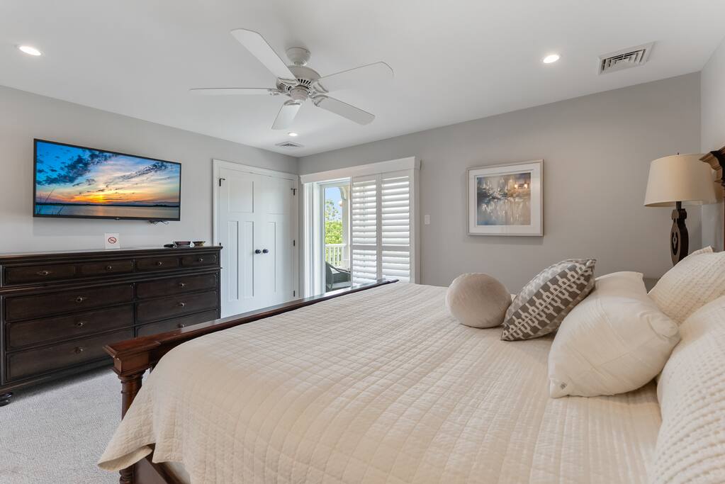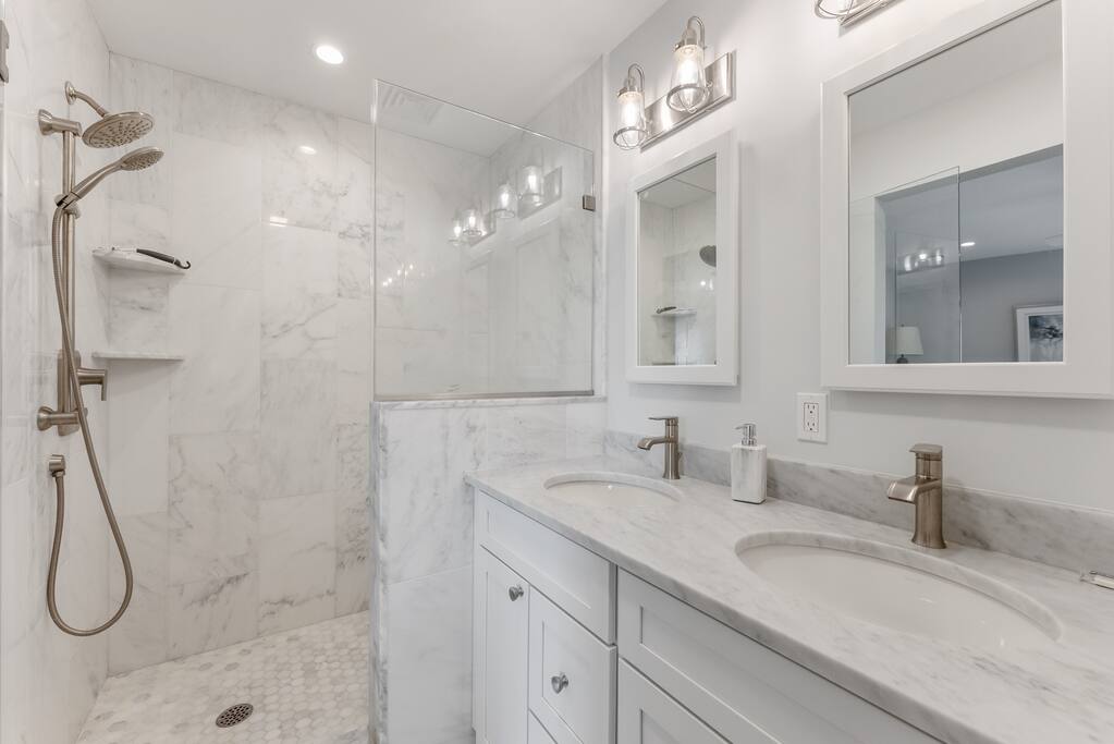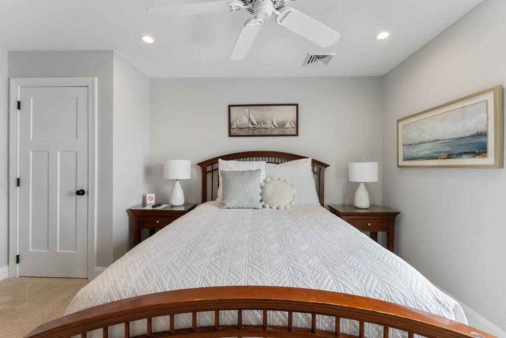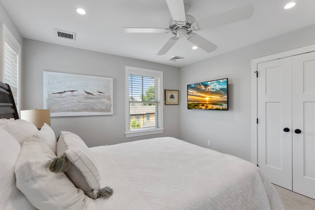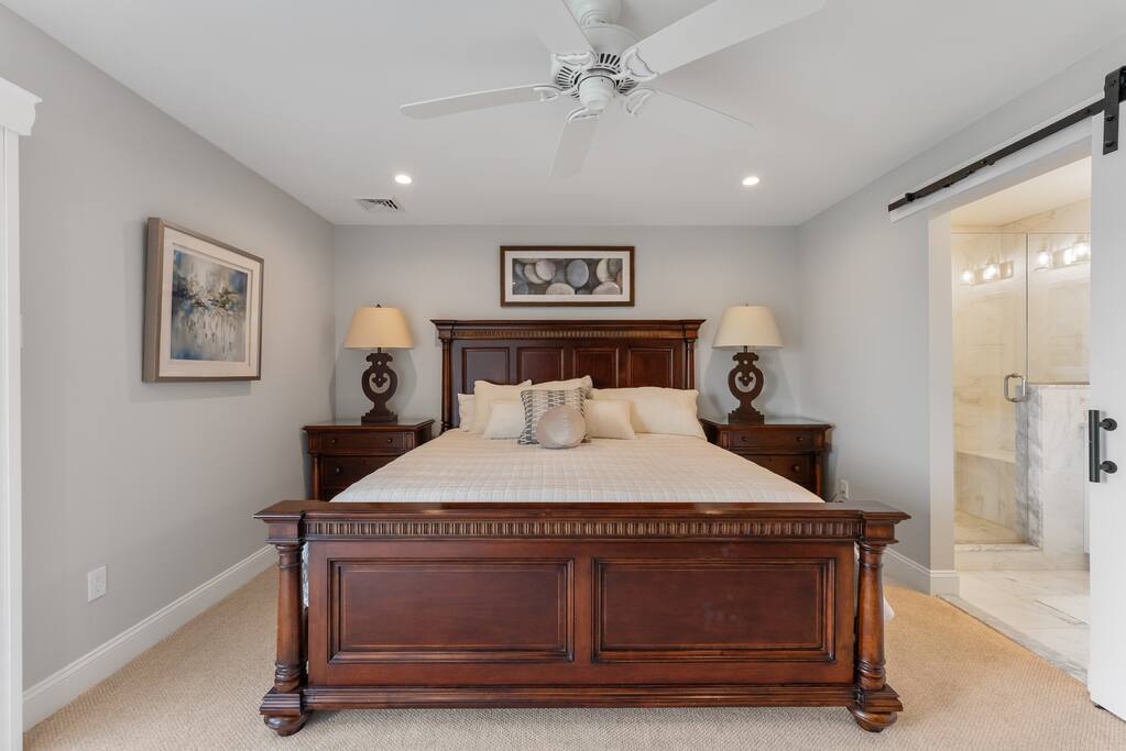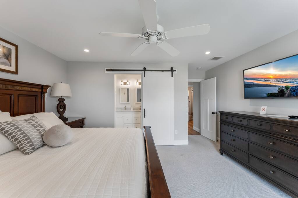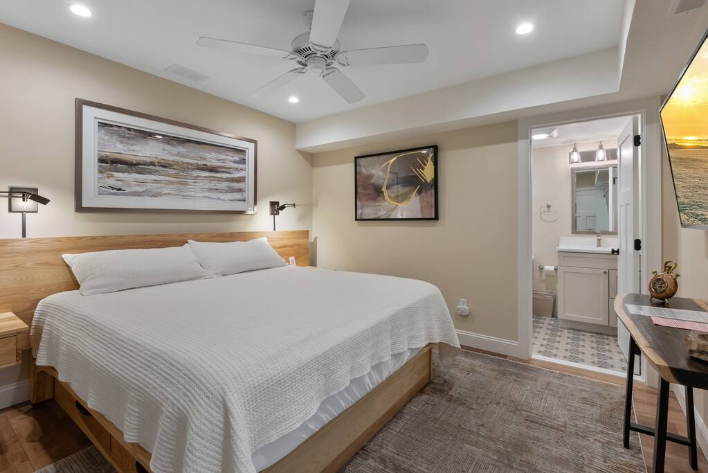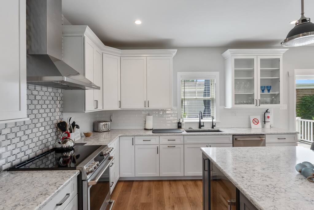 Newly Constructed End Unit Townhome in Downtown Historic Cape May NJ. The home is within walking distance to the beach, Washington St Mall and many restaurants/bars and shopping. Home is across the street from a park and a newly constructed nature/birding trail. Home Features: FEATURES: *Sleeps 8 guests, 4 bedrooms all with private full baths and TV's; 2 King, 2 Queen *Linens and Bath Towels Provided *4.5 Bathrooms *Elevator to all floors *Open Concept Living Room with Fireplace and modern kitchen with large island and dining table. *Two front private covered decks and one back private deck with BBQ grill and large dining table *Electric fireplace in Living Room *Two car garage with EV Charger *Walk to shops, restaurants, beach *Short drive to multiple wineries and golf courses *Close to Cape May/Lewes Ferry for day trips to Lewes, Rehobeth, Dewey, etc **BEDROOMS** All Bedrooms have private full baths attached for personal comfort and convenience. Linens and Bath Towels are provided. FIRST FLOOR: - One bedroom with King Bed and attached full bathroom w/ walk in shower, smart tv. THIRD FLOOR: - Large Primary Suite with king size bed, smart tv, dresser, closet, private covered patio, private bath with walk in shower, double sink vanity and private toilet closet. - Two more bedrooms with smart tv's, queen size beds, attached private baths, one with walk in shower, one with a bath tub/shower. **LIVING ROOM, KITCHEN and DECKS** Seamless flow of open concept living, dining, kitchen and large front and back decks set the stage for memorable moments. Living room has a large sectional couch with plenty of seating, heated electric fireplace, and large HD smart TV for fun movie nights or watching sports. Fully equipped modern kitchen with plenty of seating - a large island with 6 barstools, a separate dining table for 10 people, outdoor dining table for 6 people on the back deck and lounge seating on the front covered patio w/ ceiling fan. All of the amenities of a modern kitchen - Keurig coffee maker, electric induction stove/oven, microwave drawer and beverage fridge in the island, full size refrigerator/freezer, dishwasher. Plates, silverware, drinkware, serving and cooking utensils, pot/pans, bakeware. Prefer the outdoor grilling experience? Fire up the natural gas piped grill with the convenience of supplied utensils. Enjoy morning coffee or evening beverages on the large furnished, covered from patio just off of the living room. Or sit out back with sunshine on your face on the large open deck w/ polywood dining table and chairs just off the kitchen. A half bathroom for convenience, rounds out this floor. **GARAGE** Private Garage for 2 cars with driveway for additional 2 car parking, Garage is also equipped with an EV Wall Charger. Complimentary for guests during their stay. **ELEVATOR** Private Elevator providing accessibility to all 3 floors is perfect for those with mobility issues and is great for unloading groceries and accessing the upper floors of the home. **OUTDOOR SHOWER** Private enclosed outdoor shower in the backyard is perfect for rinsing off after a fun and relaxing day at the beach or walking through any of the multiple walking and birding trails.